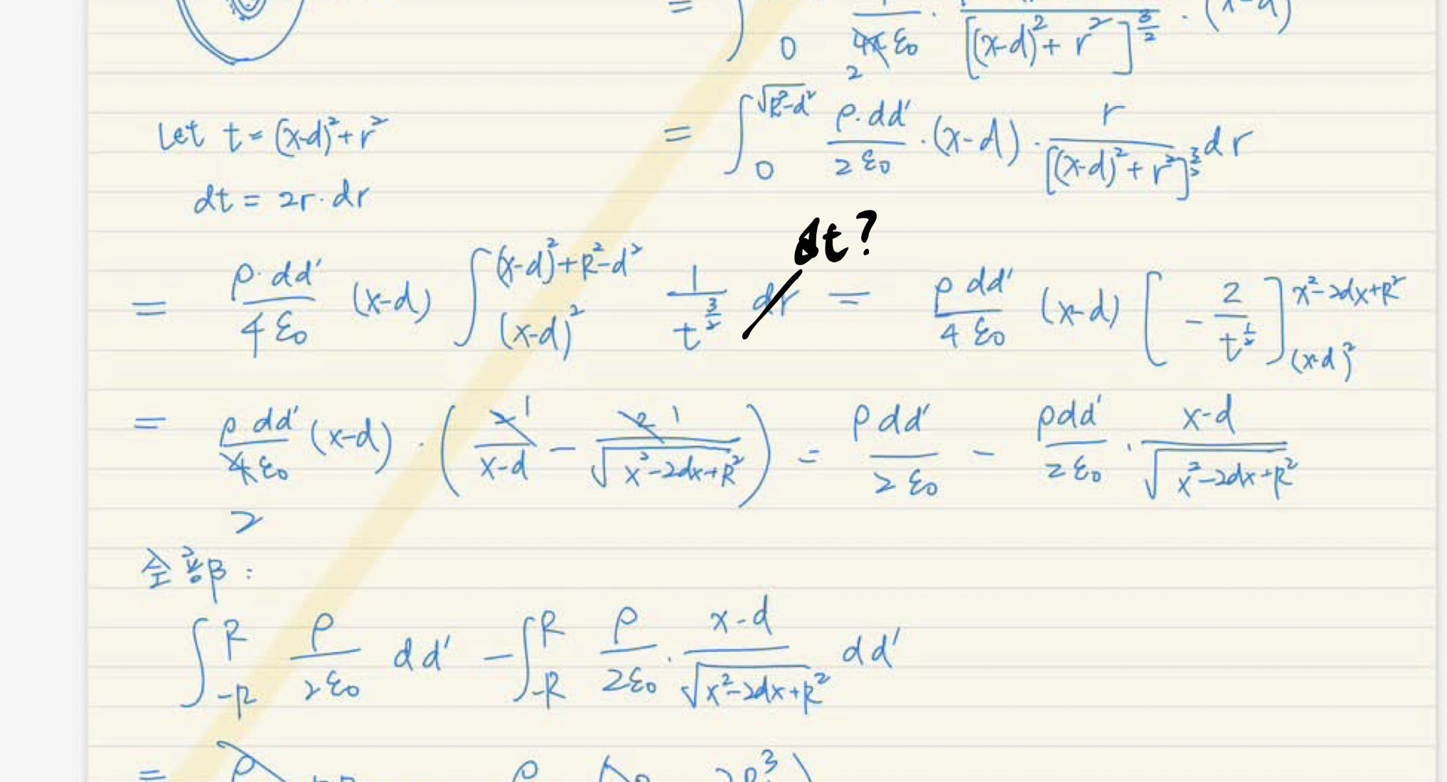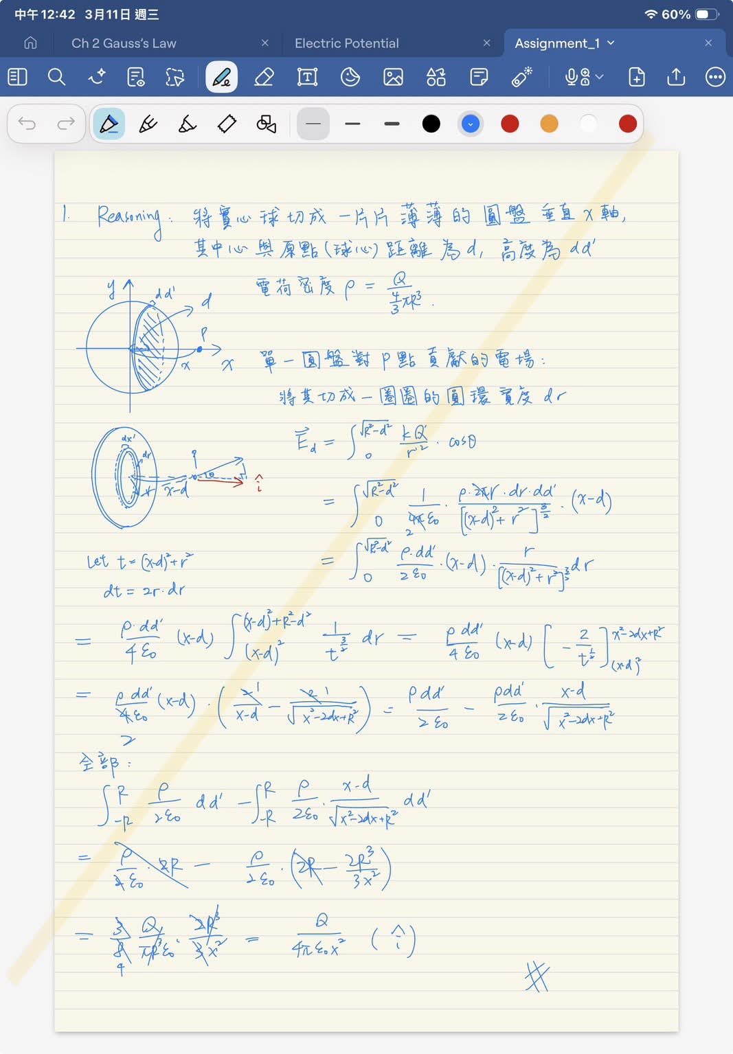 目前看起來第一題沒什麼技巧,用高斯表面的偷懶法已經被鎖住了,先找出一個圓盤造成的電場貢獻量再積分起來就可以