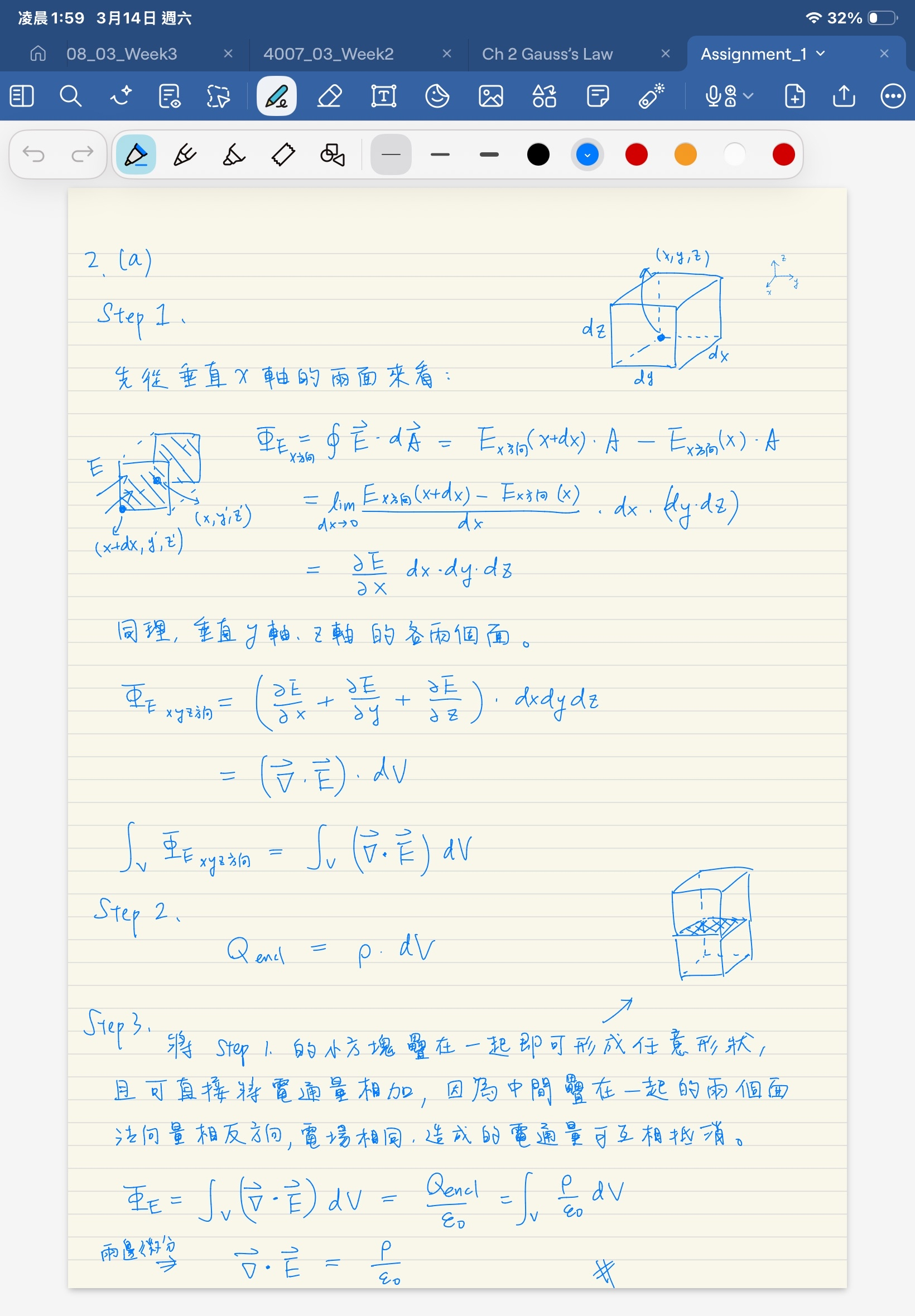 這證明我有一個疑問... 這是假設 dy dz 足夠小讓這個 vector function 的值在整個 yz 面上是等值的, 但又計算了非零的 dx 方向 vector function 差??